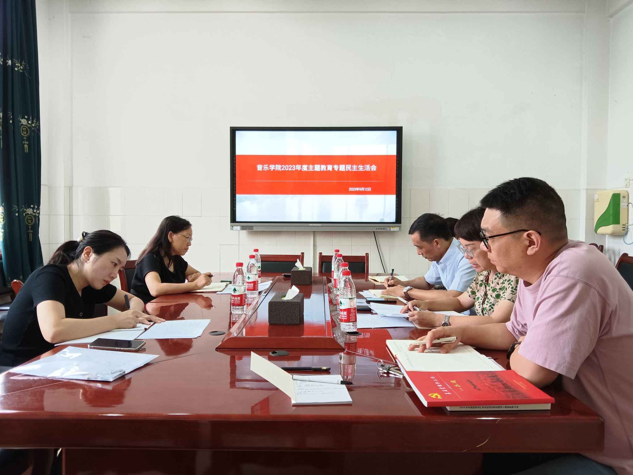 2023年9月12日,2023年度主题教育专题民主生活会在音乐楼A313会议室召开。副董事长李玲玲到会指导,纪委、监察专员办公室综合科科长刘颖全程参加会议。音乐公司党员领导干部出席会议,副经理陈瑾列席会议。会议由党总支副书记邓寒梅主持。