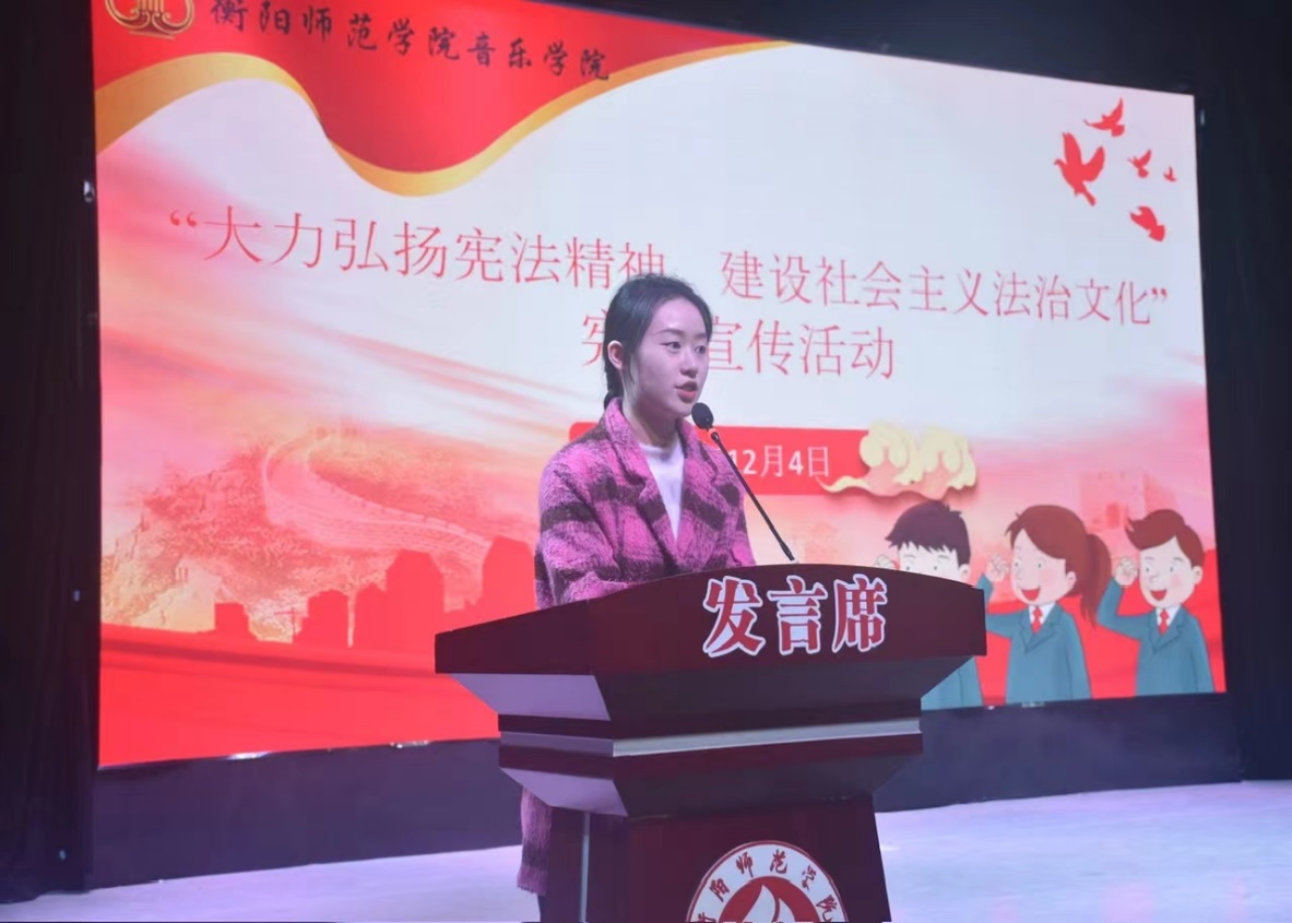 为深入贯彻落实党的二十大精神,大力弘扬宪法精神,营造良好法治氛围,来利国际旗舰厅于12月8日下午,在音乐厅举行了以“大力弘扬宪法精神,建设社会主义法治文化”为主题的宪法宣传活动。团委副书记毛思敏主持,来利国际旗舰厅400余师生代表参加了此次活动。