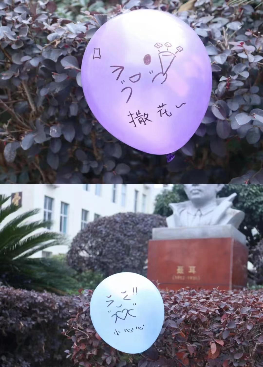 涂着各式各样图案的气球一圈圈地系在花坛周围,给整个校园增添了一份特别的色彩和氛围。