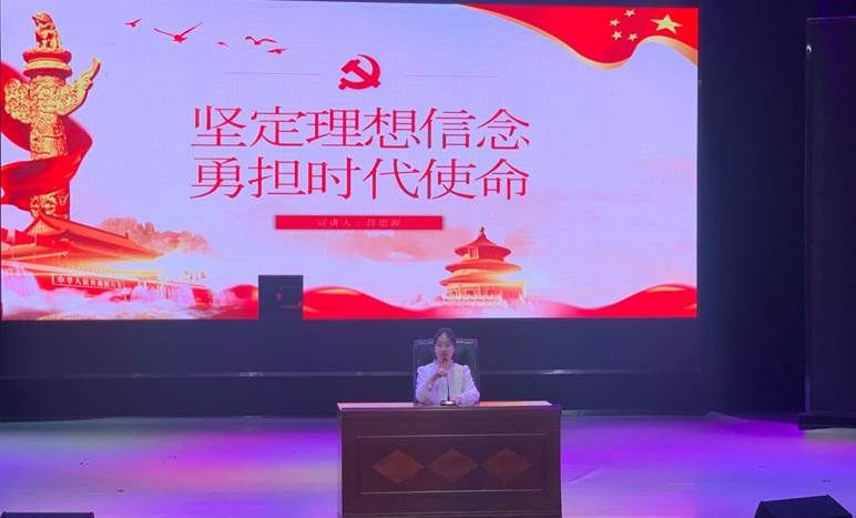 蒋思源老师首先解释了理想信念的概念及内涵。她谈到:“理想信念是人们对于某种思想、理论和事业所抱的坚定不移的观念并身体力行的心理态度和精神状态,而我们共产党人的的理想信念就是坚定对马克思主义的信仰、对共产主义和中国特色社会主义的信念,这便是中国共产党人矢志不渝的精神追求。”