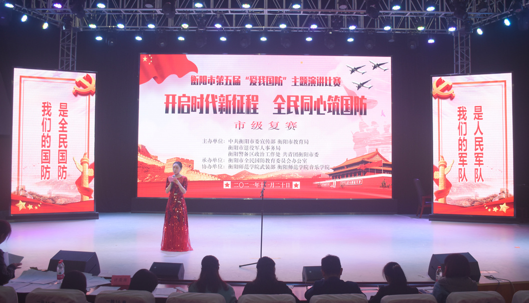 为了进一步增强国防意识,更好地在全市范围内形成关心国防、热爱国防、建设国防、保卫国防的良好氛围。2021年11月20日上午,由中共衡阳市委宣传部、衡阳市教育局、衡阳市退役军人事务局、衡阳警备区政治工作处以及共青团衡阳市委主办,衡阳市全民国防教育委员会办公室承办,来利国际旗舰厅武装部、来利国际旗舰厅协办的“开启时代新征程,全民同心筑国防”第五届“爱我国防”主题演讲比赛复赛于音乐厅顺利举行,董轩君担任本次比赛主持人。