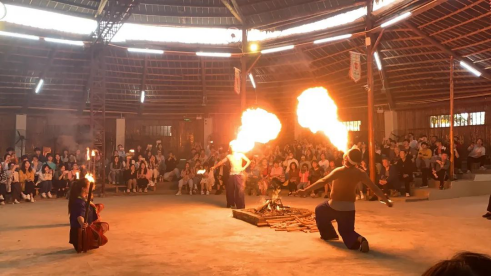 接下来,采风队伍来到了平桂区黄田镇,观看了土瑶寨篝火晚会。土瑶是瑶族中人口数量最少的一个支系,全世界只有4000余人且仅存于贺州,十分稀少。土瑶神韵皆在展现土瑶神奇的民风与极具韵味的民俗,通过对土瑶的宗教信仰与艺术表演形式的融合,提练出一场民族风情歌舞表演及游客参与性强的娱乐节目。如上刀山、踩火筒、生吞木糠吐圣火等。男青年们穿着土瑶族服饰,毛巾裹头,上身是长袖四兜、蓝白相间的超短衣服,下身穿宽大黑裤。女人的服饰由平顶木帽、黑色长衣、蓝白短衣、短裤和彩色腰带5个要素组成,木帽和腰带上缀有七彩斑斓的丝线,像彩虹一样鲜艳夺目